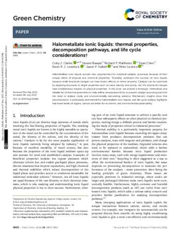 Halometallate ionic liquids: thermal properties, decomposition pathways, and life cycle considerations.
