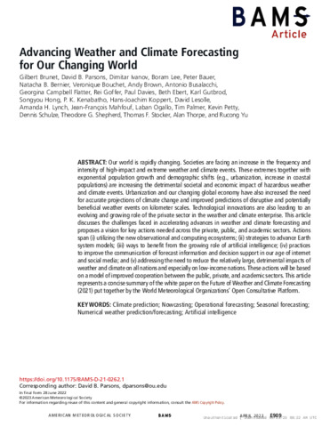 Brunet, G., Parsons, D. B., Ivanov, D., Lee, B., Bauer, P., Bernier, N. B., Bouchet, V., Brown, A., Busalacchi, A., Campbell Flatter, G., Goffer, R., Davies, P., Ebert, B., Gutbrod, K., Hong, S., Kenabatho, P. K., Koppert, H.-J., Lesolle, D., Lynch, A. H., Mahfouf, J.-F., Ogallo, L., Palmer, T., Petty, K., Schulze, D., Shepherd, T. G. orcid id iconORCID: https://orcid.org/0000-0002-6631-9968, Stocker, T. F., Thorpe, A. and Yu, R. (2023) Advancing weather and climate forecasting for our changing world. Bulletin of the American Meteorological Society, 104 (4). E909-E927. ISSN 1520-0477 doi: 10.1175/BAMS-D-21-0262.1