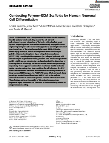 Conducting polymer-ECM scaffolds for human neuronal cell differentiation.
