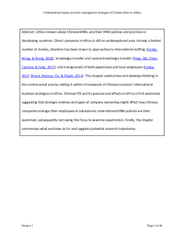 Little is known about Chinese MNEs and their HRM policies and practices in developing countries. China’s presence in Africa is still an underexplored area. Among a limited number of studies, attention has been drawn to approaches to international staffing (Cooke, Wang, & Wang, 2018), knowledge transfer and reverse knowledge transfer (Peng, Qin, Chen, Cannice, & Yang, 2017), and management of both expatriates and local employees (Cooke, 2012; Wood, Mazouz, Yin, & Cheah, 2014). This chapter summarises and develops thinking in this controversial area by setting it within a framework of Chinese investors’ international business strategies in Africa. Chinese FDI and its purpose and effects in Africa is first examined, suggesting that strategic motives and types of company ownership might affect how Chinese companies manage their employees in subsidiaries. International HRM policies are then examined, subsequently narrowing the focus to examine expatriation. Finally, the chapter summarises what we know so far and suggests potential research trajectories.