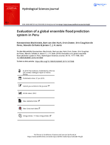 Bischiniotis, K., van den Hurk, B., Zsoter, E., Coughlan de Perez, E., Grillakis, M. and Aerts, J. C. J. H. (2019) Evaluation of a global ensemble flood prediction system in Peru. Hydrological Sciences Journal, 64 (10). pp. 1171-1189. ISSN 0262-6667 doi: 10.1080/02626667.2019.1617868