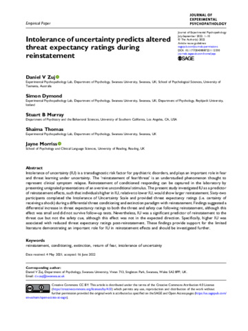 Zuj, D. V. orcid id iconORCID: https://orcid.org/0000-0002-6376-8354, Dymond, S., Murray, S. B., Thomas, S. and Morriss, J. orcid id iconORCID: https://orcid.org/0000-0002-7928-9673 (2022) Intolerance of uncertainty predicts altered threat expectancy ratings during reinstatement. Journal of Experimental Psychopathology, 13 (3). ISSN 2043-8087 doi: 10.1177/20438087221112330