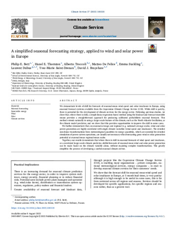 Bett, P. E., Thornton, H. E., Troccoli, A., De Felice, M., Suckling, E., Dubus, L., Saint-Drenan, Y.-M. and Brayshaw, D. J. orcid id iconORCID: https://orcid.org/0000-0002-3927-4362 (2022) A simplified seasonal forecasting strategy, applied to wind and solar power in Europe. Climate Services, 27. 100318. ISSN 2405-8807 doi: 10.1016/j.cliser.2022.100318