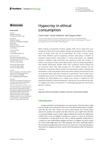 Foad, C. orcid id iconORCID: https://orcid.org/0000-0003-0423-2848, Haddock, G. and Maio, G. (2022) Hypocrisy in ethical consumption. Frontiers in Psychology, 13. 880009. ISSN 1664-1078 doi: 10.3389/fpsyg.2022.880009