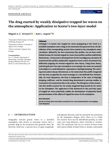 Teixeira, M. A. C. orcid id iconORCID: https://orcid.org/0000-0003-1205-3233 and Argaín, J. L. (2022) The drag exerted by weakly dissipative trapped lee waves on the atmosphere: application to Scorer’s two-layer model. Quarterly Journal of the Royal Meteorological Society, 148 (748). pp. 3211-3230. ISSN 1477-870X doi: 10.1002/qj.4355