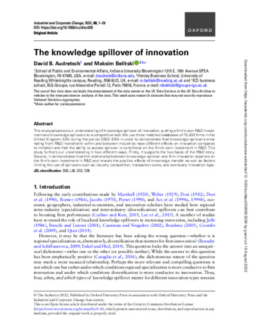 This study advances our understanding of knowledge spillover of innovation, putting a firm’s own R&D investment and knowledge spillovers to a competitive test. We use three matched databases of 15,430 firms in the United Kingdom (UK) during the period 2002–2014 in order to demonstrate that knowledge spillovers emanating from R&D investment within and between industries have different effects on innovation compared to imitation and that the ability to access spillover is conditional on the firm’s own investment in R&D. This study furthers our understanding in two different ways. Firstly, it supports the two faces of the R&D story. Second, it demonstrates that the relationship between knowledge spillover and firm innovation depends on the firm’s own investment in R&D and reveals the positive effects of knowledge transfer as well as factors limiting the use of spillovers such as industry competition, transaction costs, and eventually innovation type.