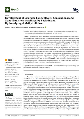 Kampa, J., Frazier, R. orcid id iconORCID: https://orcid.org/0000-0003-4313-0019 and Rodriguez Garcia, J. orcid id iconORCID: https://orcid.org/0000-0002-4986-3144 (2022) Development of saturated fat replacers: conventional and nano-emulsions stabilised by lecithin and hydroxylpropyl methylcellulose. Foods, 11 (16). 2536. ISSN 2304-8158 doi: 10.3390/foods11162536
