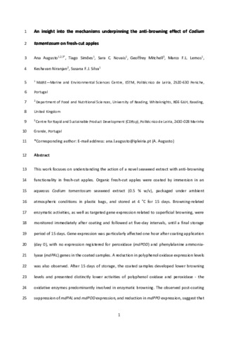 This work focuses on understanding the action of a novel seaweed extract with anti-browning functionality in fresh-cut apples. Organic fresh-cut apples were coated by immersion in an aqueous Codium tomentosum seaweed extract (0.5 % w/v), packaged under ambient atmospheric conditions in plastic bags, and stored at 4 ˚C for 15 days. Browning-related enzymatic activities, as well as targeted gene expression related to superficial browning, were monitored immediately after coating and followed at five-day intervals, until a final storage period of 15 days. Gene expression was particularly affected one hour after coating application (day 0), with no expression registered for peroxidase (mdPOD) and phenylalanine ammonia-lyase (mdPAL) genes in the coated samples. A reduction in polyphenol oxidase expression levels was also observed. After 15 days of storage, the coated samples developed lower browning levels and presented distinctly lower activities of polyphenol oxidase and peroxidase - the oxidative enzymes predominantly involved in enzymatic browning. The observed post-coating suppression of mdPAL and mdPOD expression, and reduction in mdPPO expression, suggest that the seaweed C. tomentosum extract delays the activation of these genes, and decreases enzymatic activity, which in turn accounts for the coating’s anti-browning effect.