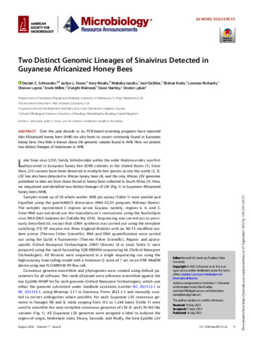 Schroeder, D. C. orcid id iconORCID: https://orcid.org/0000-0001-5991-2838, Stone, J. L., Weeks, A., Jacobs, M., DaSilva, J., Butts, S., Richards, L., Layne, S., Miller, E., Walrond, D., Hartley, D. and Lyken, D. (2022) Two distinct genomic lineages of sinaivirus detected in Guyanese Africanized honey bees. Microbiology Resource Announcements, 11 (8). e00512-22. ISSN 2576-098X doi: 10.1128/mra.00512-22
