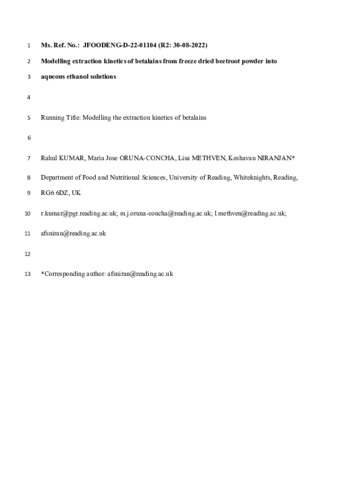 Modelling extraction kinetics of betalains from freeze dried beetroot powder into aqueous ethanol solutions