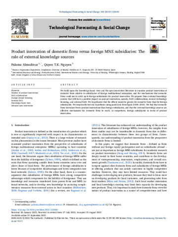 Almodóvar, P. and Nguyen, Q. T. K. orcid id iconORCID: https://orcid.org/0000-0003-0179-3973 (2022) Product innovation of domestic firms versus foreign MNE subsidiaries: the role of external knowledge sources. Technological Forecasting and Social Change, 184. 122000. ISSN 0040-1625 doi: 10.1016/j.techfore.2022.122000