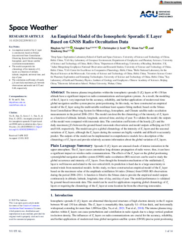 Yu, B., Xue, X., Scott, C. J. orcid id iconORCID: https://orcid.org/0000-0001-6411-5649, Yue, X. and Dou, X. (2022) An empirical model of the ionospheric sporadic E layer based on GNSS radio occultation data. Space Weather, 20 (8). e2022SW003113. ISSN 1542-7390 doi: 10.1029/2022SW003113