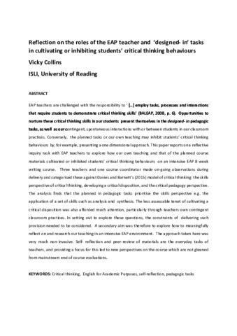 Reflection on the roles of the EAP teacher and 'designed-in' tasks in cultivating or inhibiting students' critical thinking behaviours.