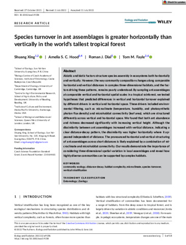 Xing, S., Hood, A. S. C. orcid id iconORCID: https://orcid.org/0000-0003-3803-0603, Dial, R. J. and Fayle, T. M. (2022) Species turnover in ant assemblages is greater horizontally than vertically in the world's tallest tropical forest. Ecology and Evolution, 12 (8). e9158. ISSN 2045-7758 doi: 10.1002/ece3.9158
