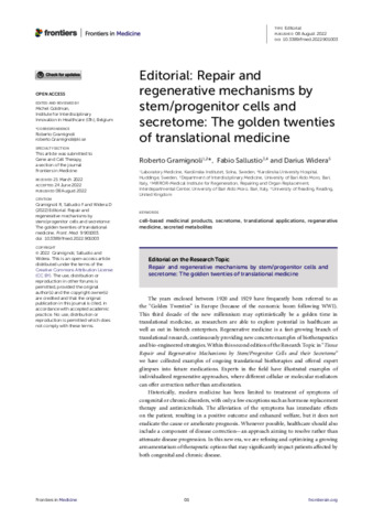 Gramignoli, R., Sallustio, F. and Widera, D. orcid id iconORCID: https://orcid.org/0000-0003-1686-130X, eds. (2022) Tissue repair and regenerative mechanisms by stem/progenitor cells and their secretome, volume II. Frontiers in Medicine. Frontiers. doi: 10.3389/fmed.2022.901003