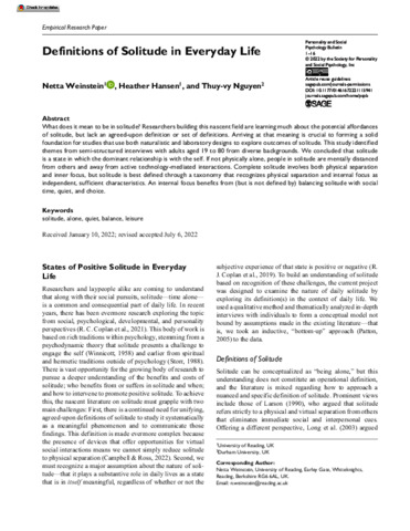 Weinstein, N. orcid id iconORCID: https://orcid.org/0000-0003-2200-6617, Hansen, H. and Nguyen, T.-v. (2023) Definitions of solitude in everyday life. Personality and Social Psychology Bulletin, 49 (12). pp. 1663-1678. ISSN 0146-1672 doi: 10.1177/01461672221115941