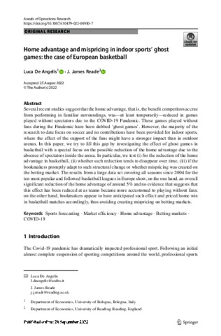 De Angelis, L. and Reade, J. J. orcid id iconORCID: https://orcid.org/0000-0002-8610-530X (2023) Home advantage and mispricing in indoor sports’ ghost games: the case of European basketball. Annals of Operations Research, 325. pp. 391-418. ISSN 1572-9338 doi: 10.1007/s10479-022-04950-7