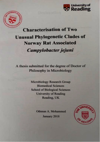 Mohammed, O. A. (2022) Characterisation of two unusual phylogenetic clades of Norway rat associated Campylobacter jejuni. PhD thesis, University of Reading. doi: 10.48683/1926.00107299