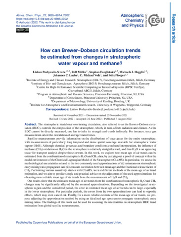 Poshyvailo-Strube, L. orcid id iconORCID: https://orcid.org/0000-0002-4891-6988, Müller, R. orcid id iconORCID: https://orcid.org/0000-0002-5024-9977, Fueglistaler, S. orcid id iconORCID: https://orcid.org/0000-0002-0419-440X, Hegglin, M. I. orcid id iconORCID: https://orcid.org/0000-0003-2820-9044, Laube, J. C. orcid id iconORCID: https://orcid.org/0000-0001-9683-5931, Volk, C. M. and Ploeger, F. (2022) How can Brewer–Dobson circulation trends be estimated from changes in stratospheric water vapour and methane? Atmospheric Chemistry and Physics, 22 (15). pp. 9895-9914. ISSN 1680-7316 doi: 10.5194/acp-22-9895-2022