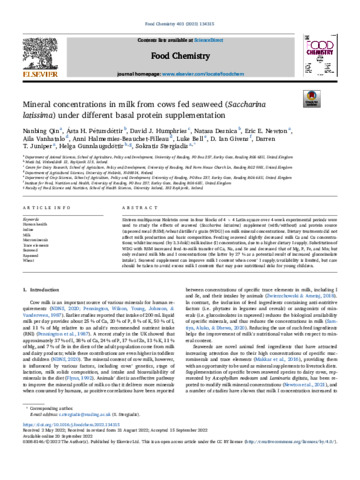 Mineral concentrations in milk from cows fed seaweed (Saccharina latissima) under different basal protein supplementation.