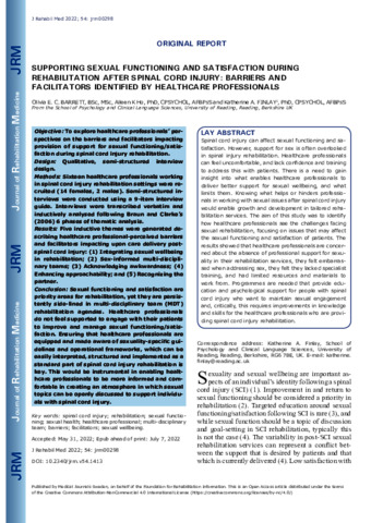 Supporting sexual functioning and satisfaction during rehabilitation after spinal cord injury: barriers and facilitators identified by healthcare professionals.