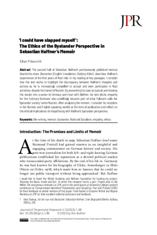 Pilsworth, E. orcid id iconORCID: https://orcid.org/0000-0001-7379-0996 (2023) ‘I could have slapped myself’: the ethics of the bystander perspective in sebastian haffner’s memoir. Journal of Perpetrator Research, 5 (1). pp. 1-28. ISSN 2514-7897 doi: 10.21039/jpr.5.1.96