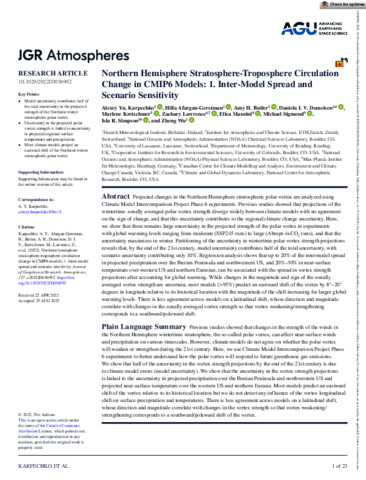 Karpechko, A. Y. orcid id iconORCID: https://orcid.org/0000-0003-0902-0414, Afargan‐Gerstman, H. orcid id iconORCID: https://orcid.org/0000-0002-9169-2764, Butler, A. H. orcid id iconORCID: https://orcid.org/0000-0002-3632-0925, Domeisen, D. I. V. orcid id iconORCID: https://orcid.org/0000-0002-1463-929X, Kretschmer, M. orcid id iconORCID: https://orcid.org/0000-0002-2756-9526, Lawrence, Z. orcid id iconORCID: https://orcid.org/0000-0003-0901-3839, Manzini, E. orcid id iconORCID: https://orcid.org/0000-0002-9405-7838, Sigmond, M. orcid id iconORCID: https://orcid.org/0000-0003-2191-9756, Simpson, I. R. orcid id iconORCID: https://orcid.org/0000-0002-2915-1377 and Wu, Z. orcid id iconORCID: https://orcid.org/0000-0002-2054-5724 (2022) Northern hemisphere stratosphere‐troposphere circulation change in CMIP6 models: 1. inter‐model spread and scenario sensitivity. Journal of Geophysical Research: Atmospheres, 127 (18). e2022JD036992. ISSN 2169-8996 doi: 10.1029/2022jd036992