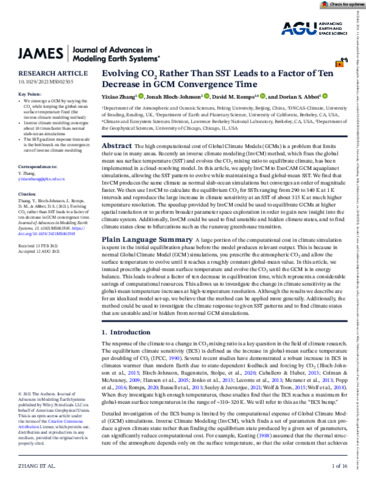 Zhang, Y., Bloch-Johnson, J. orcid id iconORCID: https://orcid.org/0000-0002-8465-5383, Romps, D. M. and Abbot, D. S. (2021) Evolving CO2 rather than SST leads to a factor of ten decrease in GCM convergence time. Journal of Advances in Modeling Earth Systems, 13 (11). e2021MS002505. ISSN 1942-2466 doi: 10.1029/2021MS002505