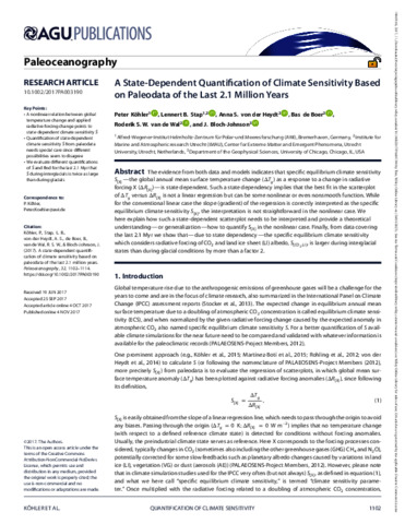 Köhler, P., Stap, L. B., von der Heydt, A. S., de Boer, B., van de Wal, R. S. W. and Bloch-Johnson, J. orcid id iconORCID: https://orcid.org/0000-0002-8465-5383 (2017) A state-dependent quantification of climate sensitivity based on paleodata of the last 2.1 million years. Paleoceanography, 32 (11). pp. 1102-1114. ISSN 2572-4525 doi: 10.1002/2017PA003190