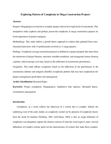 Purpose: Megaprojects are known as complex projects that involve high levels of uncertainty. This interpretive study explores and portrays perceived complexity in mega construction projects by lived experiences of project managers. Methodology: This study utilises a ground theory approach to analyse data gathered from semi-structured interviews with 18 professionals involved in 11 mega projects. Findings: Complexity in mega construction projects is defined as a project property that stems from the interaction of project features, uncertain variables/conditions, and managerial actions forming a pattern, which emerges over time, based on the reflections of construction practitioners. Originality: This study defines complexity based on the reflections of the practitioners in the construction industry and uniquely identifies complexity patterns that may have implications for project management, particularly risk management.