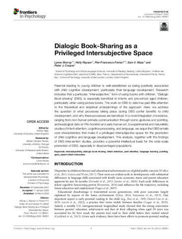 Murray, L., Rayson, H., Ferrari, P.-F., Wass, S. V. and Cooper, P. J. (2022) Dialogic book-sharing as a privileged intersubjective space. Frontiers in Psychology, 13. 786991. ISSN 1664-1078 doi: 10.3389/fpsyg.2022.786991