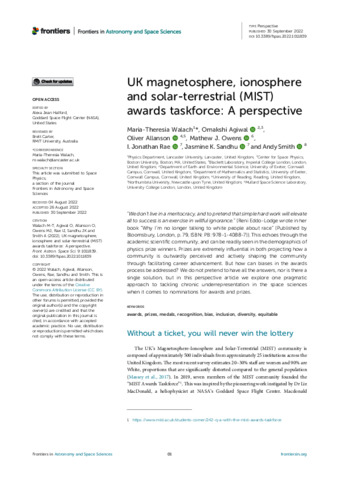 Walach, M.-T., Agiwal, O., Allanson, O., Owens, M. J. orcid id iconORCID: https://orcid.org/0000-0003-2061-2453, Rae, I. J., Sandhu, J. K. and Smith, A. (2022) UK magnetosphere, ionosphere and solar-terrestrial (MIST) awards taskforce: a perspective. Frontiers in Astronomy and Space Science, 9. 1011839. ISSN 2296-987X doi: 10.3389/fspas.2022.1011839