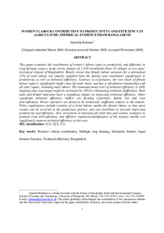 Rahman, S. orcid id iconORCID: https://orcid.org/0000-0002-0391-6191 (2010) Women’s labour contribution to productivity and efficiency in agriculture: empirical evidence from Bangladesh. Journal of Agricultural Economics, 61 (2). pp. 318-342. ISSN 1477-9552 doi: 10.1111/j.1477-9552.2010.00243.x