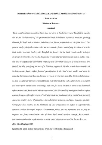 Determinants of agricultural land rental market transactions in Bangladesh.