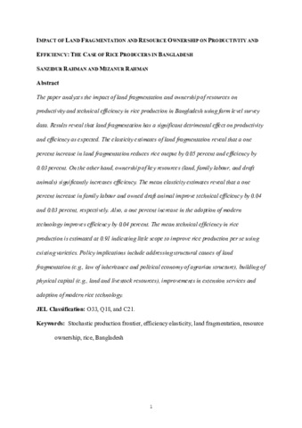 Impact of land fragmentation and resource ownership on productivity and efficiency: the case of rice producers in Bangladesh.