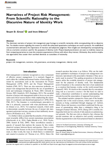 Green, S. D. orcid id iconORCID: https://orcid.org/0000-0003-1660-5592 and Dikmen, I. orcid id iconORCID: https://orcid.org/0000-0002-6988-7557 (2022) Narratives of project risk management: from scientific rationality to the discursive nature of identity work. Project Management Journal, 53 (6). pp. 608-624. ISSN 1938-9507 doi: 10.1177/87569728221124496