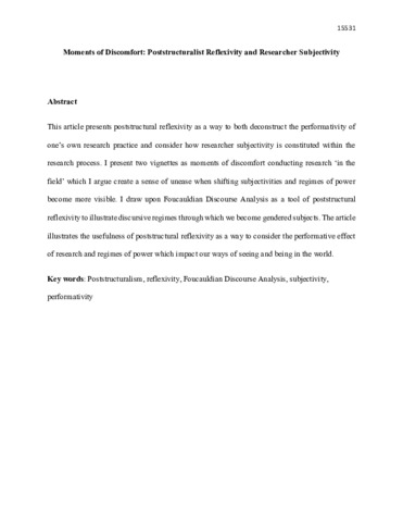 This article presents poststructural reflexivity as a way to both deconstruct the performativity of one’s own research practice and consider how researcher subjectivity is constituted within the research process. I present two vignettes as moments of discomfort conducting research ‘in the field’ which we argue create a sense of unease when shifting subjectivities and regimes of power become more visible. I draw upon Foucauldian Discourse Analysis as a tool of poststructural reflexivity to illustrate discursive regimes through which we become gendered subjects. The article illustrates the usefulness of poststructural reflexivity as a way to consider the performative effect of research and regimes of power which impact our ways of seeing and being in the world.