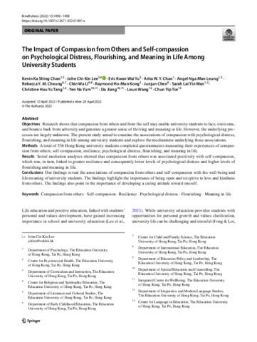 Additional Information | Chan, K. K. S., Lee, J. C.-K., Yu, E. K. W., Chan, A. W. Y., Leung, A. N. M., Cheung, R. Y. M., . . . Tse, C. Y. (2022). The impact of compassion from others and self-compassion on psychological distress, flourishing, and meaning in life among university students. Mindfulness. Advance online publication. doi: 10.1007/s12671-022-01891-x |