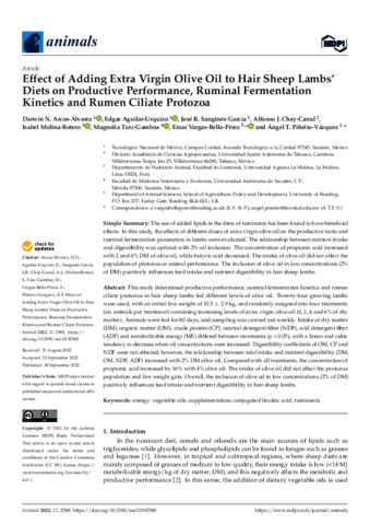 Arcos-Álvarez, D. N. orcid id iconORCID: https://orcid.org/0000-0003-3780-0688, Aguilar-Urquizo, E. orcid id iconORCID: https://orcid.org/0000-0003-4727-7894, Sanginés-García, J. R., Chay-Canul, A. J., Molina-Botero, I. orcid id iconORCID: https://orcid.org/0000-0003-1108-6359, Tzec-Gamboa, M. orcid id iconORCID: https://orcid.org/0000-0002-2895-1890, Vargas-Bello-Pérez, E. orcid id iconORCID: https://orcid.org/0000-0001-7105-5752 and Piñeiro-Vázquez, Á. T. (2022) Effect of adding extra virgin olive oil to hair sheep lambs’ diets on productive performance, ruminal fermentation kinetics and rumen ciliate protozoa. Animals, 12 (19). 2588. ISSN 2076-2615 doi: 10.3390/ani12192588