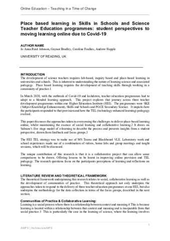 Place based learning in skills in schools and science teacher education programmes: student perspectives to moving learning online due to Covid-19.