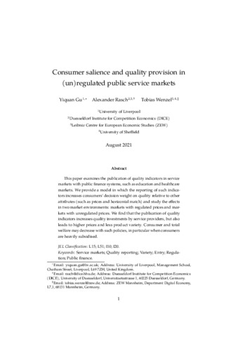 Gu, Y. orcid id iconORCID: https://orcid.org/0000-0002-4594-4852, Rasch, A. orcid id iconORCID: https://orcid.org/0000-0001-9017-1898 and Wenzel, T. (2022) Consumer salience and quality provision in (un)regulated public service markets. Regional science and urban economics, 93. 103754. ISSN 0166-0462 doi: 10.1016/j.regsciurbeco.2021.103754