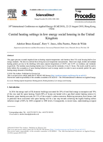 Bruce-Konuah, A., Jones, R. V. orcid id iconORCID: https://orcid.org/0000-0002-2716-9872, Fuertes, A. orcid id iconORCID: https://orcid.org/0000-0002-6224-1489 and de Wilde, P. (2019) Central heating settings in low energy social housing in the United Kingdom. Energy Procedia, 158. pp. 3399-3404. ISSN 1876-6102 doi: 10.1016/j.egypro.2019.01.941