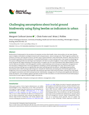 Cathcart-James, M., Foster, C. and Pickles, B. orcid id iconORCID: https://orcid.org/0000-0002-9809-6455 (2022) Challenging assumptions about burial ground biodiversity using flying beetles as indicators in urban areas. Journal of Urban Ecology, 8 (1). juac024. ISSN 2058-5543 doi: 10.1093/jue/juac024