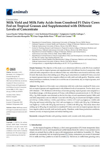 The objective of this study was to determine milk fatty acids from crossbred F1 dairy cows fed on tropical grasses and supplemented with different levels of concentrate. Twelve dairy cows (50% Holstein x 50% Brahman) with 60 days of lactation grazing tropical grasses were assigned to a Switchback design, with three periods of 15 days with different concentrate levels: 0, 150, 300 and 450 g /kg. Milk samples were obtained on the last five days of each experimental period. Milk yield and milk composition were not affected. Cows fed with 300 g/kg of concentrate had higher contents of C15:0 (p = 0.004), C22:0 (p = 0.031), and C24:0 (p = 0.013). C17:1 cis9 was higher (p = 0.039) with 150 g/kg and lowest with 450 g/kg. C18:1 cis9 was higher (p = 0.042) with 150 g/kg. C18:2n6trans was higher (p = 0.05) with 300 g/kg and lower (p = 0.018) with 450 g/kg. This study shows that adding up to 450 g/kg of concentrate to crossbred F1 dairy cows fed on tropical grasses does not have negative effects on milk yield and milk quality. Therefore, under these production conditions, farmers can rely on tropical grasses and reduce feeding costs.