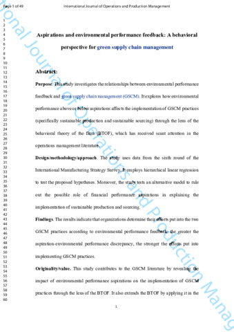 Purpose This study investigates the relationships between environmental performance feedback and green supply chain management (GSCM). It explores how environmental performance above or below aspirations affects the implementation of GSCM practices (specifically sustainable production [SP] and sustainable sourcing [SS]) through the lens of the behavioral theory of the firm (BTOF), which has received scant attention in the operations management literature. Design/methodology/approach The study used data from the sixth round of the International Manufacturing Strategy Survey (IMSS). It employed hierarchical linear regression to test the proposed hypotheses. Moreover, the study tested an alternate model to rule out the possible role of financial performance aspirations in explaining the implementation of SP and SS. Findings The results indicate that organizations determine their efforts put into the two GSCM practices according to environmental performance feedback: the greater the aspiration–environmental performance discrepancy, the stronger the efforts put into implementing GSCM practices. Originality/value This study contributes to the GSCM literature by revealing the impact of environmental performance aspirations on the implementation of GSCM practices through the lens of the BTOF. It also extends the BTOF by applying it in the GSCM context and indicating that performance feedback is based on environmental performance instead of financial performance in this specific context.