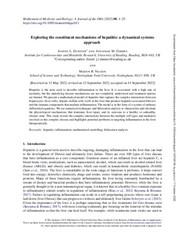Dunster, J. L. orcid id iconORCID: https://orcid.org/0000-0001-8986-4902, Gibbins, J. M. orcid id iconORCID: https://orcid.org/0000-0002-0372-5352 and Nelson, M. R. (2023) Exploring the constituent mechanisms of hepatitis: a dynamical systems approach. Mathematical Medicine and Biology: A Journal of the IMA, 40 (1). pp. 24-48. ISSN 1477-8599 doi: 10.1093/imammb/dqac013