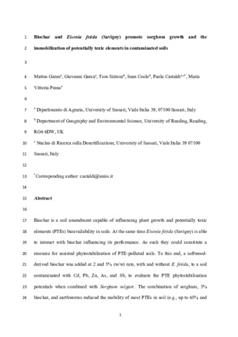 Biochar and Eisenia fetida (Savigny) promote sorghum growth and the immobilization of potentially toxic elements in contaminated soils.