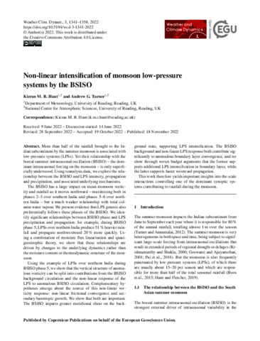 Non-linear intensification of monsoon low pressure systems by the BSISO.