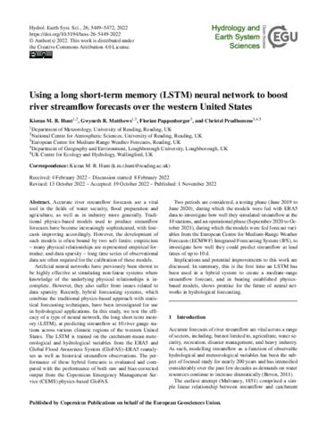 Hunt, K. M. R. orcid id iconORCID: https://orcid.org/0000-0003-1480-3755, Matthews, G. R., Pappenberger, F. and Prudhomme, C. (2022) Using a long short-term memory (LSTM) neural network to boost river streamflow forecasts over the western United States. Hydrology and Earth System Sciences, 26 (21). pp. 5449-5472. ISSN 1027-5606 doi: 10.5194/hess-26-5449-2022