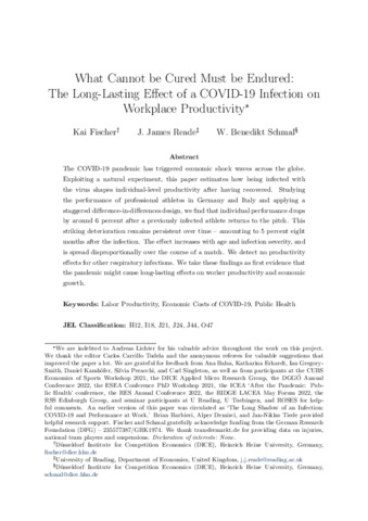 Fischer, K., Reade, J. J. orcid id iconORCID: https://orcid.org/0000-0002-8610-530X and Schmal, W. B. (2022) What cannot be cured must be endured: the long-lasting effect of a COVID-19 infection on workplace productivity. Labour Economics, 79. 102281. ISSN 0927-5371 doi: 10.1016/j.labeco.2022.102281